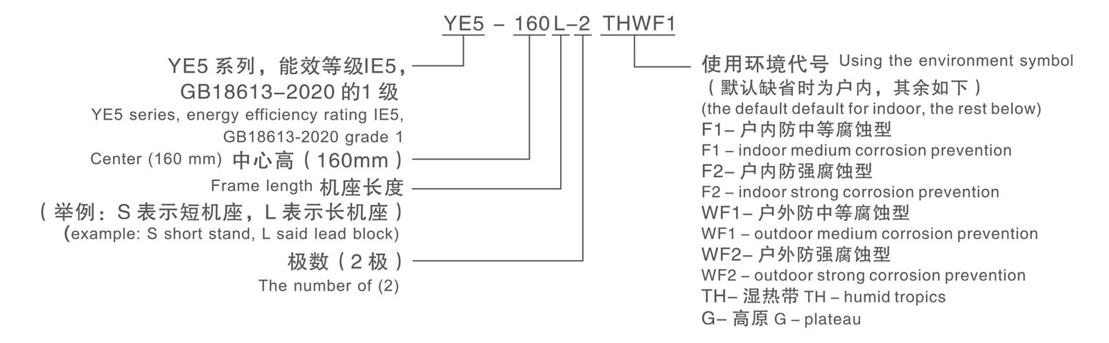 YE5系列三相异步电动机具有外形美观、高效率低噪音、低振动、安全可靠、维护方便等特点,广泛应用于风机、水泵、空压机、机床、减速机、包装机械、洗涤机械、矿山机械、建筑机械等各类传动机械行业。型号说明